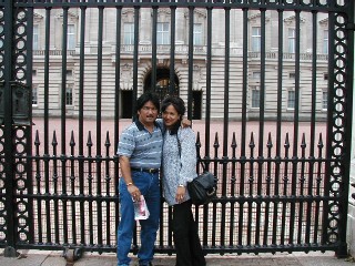 Mike & Veronne stand in front of the gate to Buckingham Palace