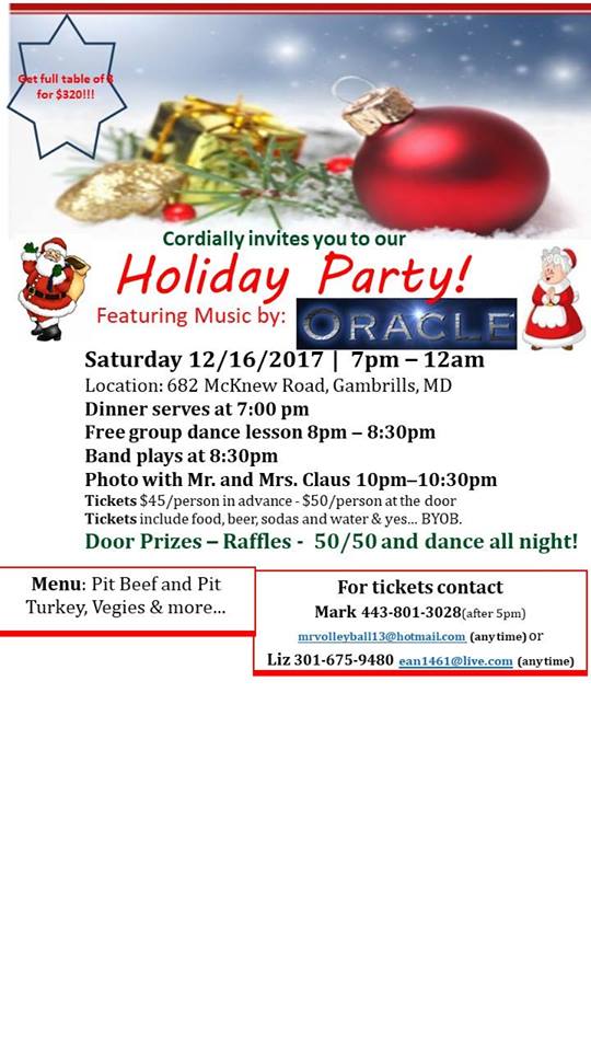 Oracle Band Holiday Party | Gambrills Athletic Club 682 McKnew Rd Gambrills, MD 21054 Information |